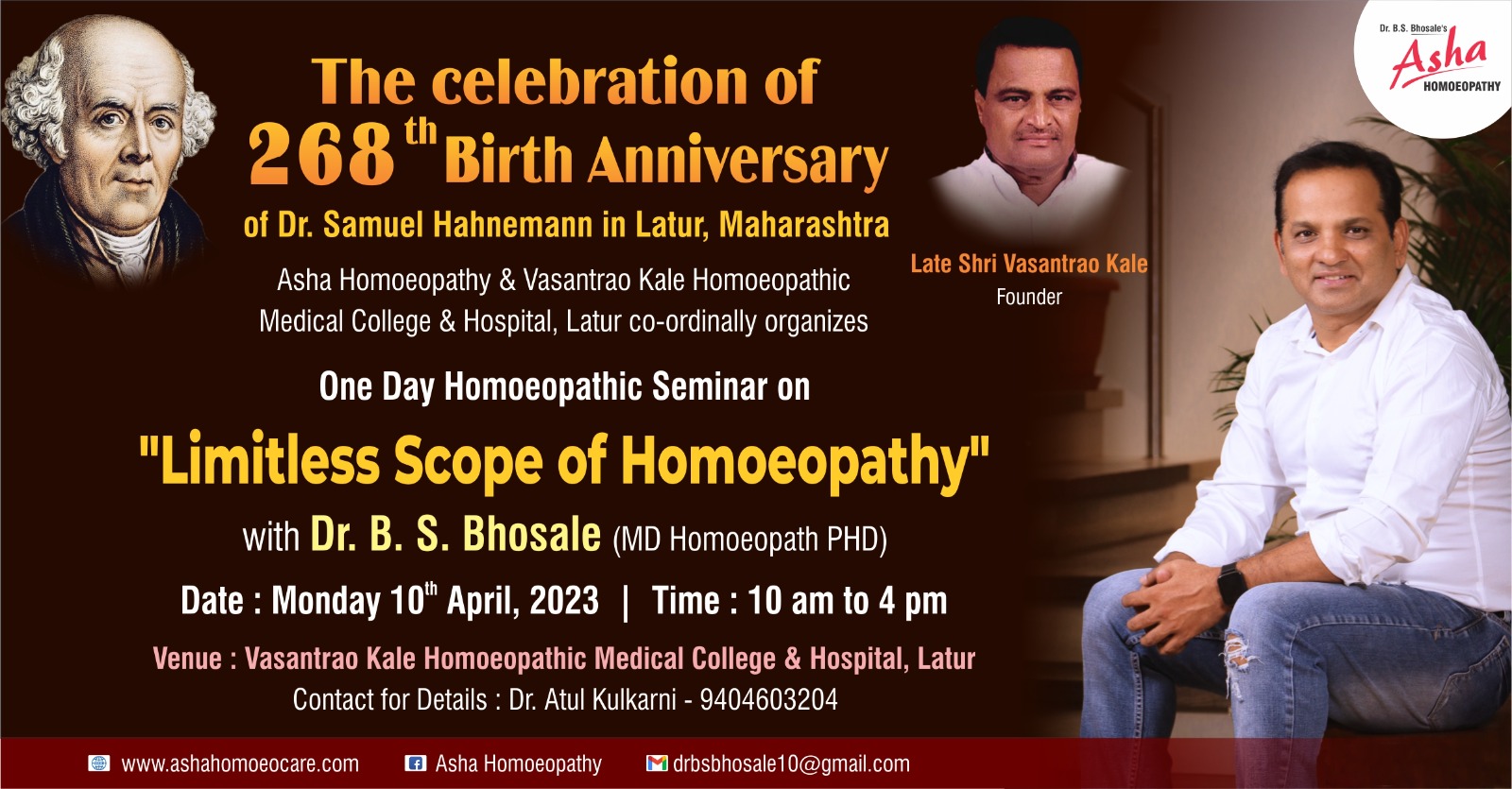 « All Events This event has passed. One Day Homoeopathic Seminar in Latur April 10, 2023 @ 10:00 am - 4:00 pm « One Day Homoeopathic Seminar in Miraj आशा होमिओपॅथी आयोजित फ्री कन्सल्टिंग होमिओपॅथिक कॅम्प चिपळूण मध्ये » + Google Calendar+ iCal Export Details Date: April 10, 2023 Time: 10:00 am - 4:00 pm